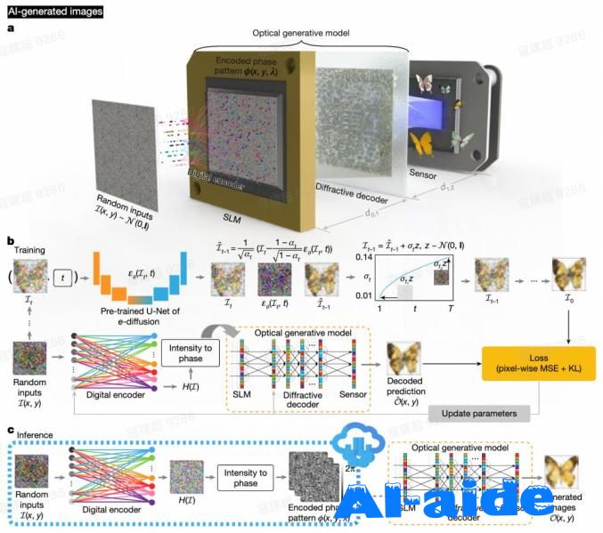 在这一架构中,一个浅层、快速的数字编码器首先将随机噪声映射为相位图案,这些图案作为目标数据分布的光学生成种子。随后,一个联合训练的、基于自由空间传播的可重构解码器对这些种子进行全光学处理,从而生成前所未见的图像,并遵循预期的数据分布。